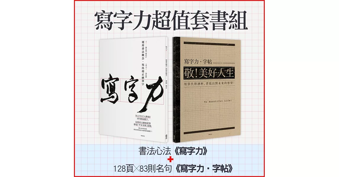 內容簡介  為五月天《入陣曲》MV霸氣題字、  為蔡英文總統提筆揮毫「平安金猴」春聯,  書法家林佳穎  教你如何寫出有靈魂的硬體字!    遵從書法的心法教學+超值份量128頁83則名句練字,  寫出自己的風格文字    ★深究書法之美二十年,書法家林佳穎為硬筆字注入墨之靈氣。  ★遵從書法的心法教學+超值份量128頁83則名句練字,寫出自己的風格文字。  ★字帖提供刷淡格線、空白格,可循序漸進練字;並且選用日本進口上質道林紙,吸墨乾脆,行筆流暢。    《寫字力:運用書法概念,寫出端正硬筆字》  書法之所以好看,在於其一筆一畫之間的靈氣,就算寫出美形字,缺乏風格也是枉然。  ★正宗科班出生,純正書法血統  作者從美術班開始,到書畫系研究所,將二十年醞釀而成的寫字心法,注入每一個硬筆字之中。  ★遵循書法規範,成就硬筆字之骨架  九宮格為基線,字寫八分滿,以中宮為基點……,透過書法的規範,能清楚了解文字的空間布局。  ★拆解文字,看見字形的邏輯  基本筆畫的組合、兩個字形的組合,找出完美比例……,讓寫字多了發現的樂趣。  ★日常生活展現寫字力  寫中式信封該如何找到無形的線,便條紙使用行書最方便等,小訣竅讓書寫更順暢。    《寫字力‧字帖:敬!美好人生》  用筆代替酒杯,書寫出對未來的想望!  精挑古今中外關於「人生思考」的名句嘉言83首,讓寫字不再是枯燥乏味的學習,更是整理自我的沉潛時間。    |